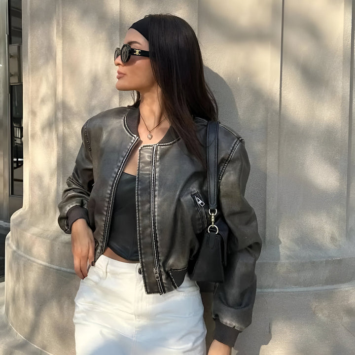 Kožená podzimní bunda Amira vyzařuje sílu a rafinovanost v jednom moderním designu. Se svým drsným koženým vzhledem a krátkým bomber stylem je to bunda, která okamžitě dodá tvému outfitu edgy a sebevědomý vzhled.