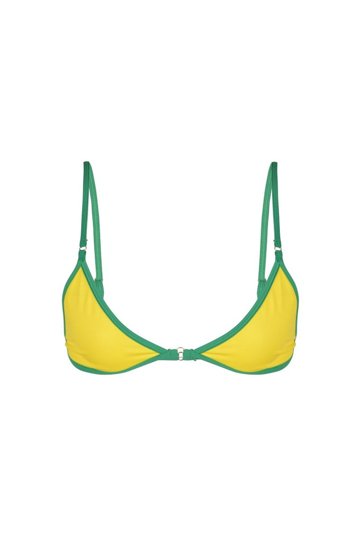 Top FRIDA v barvě žluté. Představuje sportovní a chic střih, zlaté kroužky a nastavitelné ramínka na ramenou a zádech.